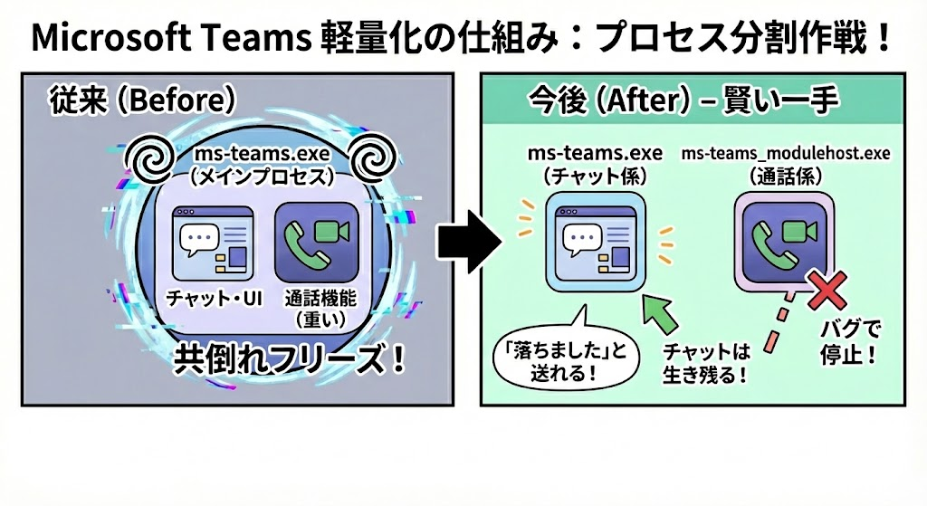 トータルのメモリ使用量が本当に減るのか、それとも単にタスクマネージャーに並ぶ「Teams.exe」の数が増えるだけなのか──実際の効果は実装を待つしかありません。