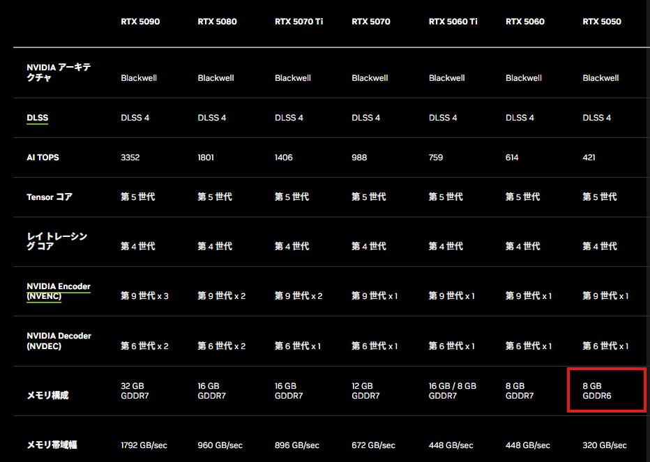 まず前提として、現在市販されているGeForce RTX 5050はRTX 50シリーズ全体の中で唯一のGDDR6搭載モデルだという点を押さえておきたい。RTX 5060以上のモデルがすべてGDDR7を採用する中、エントリーに位置するRTX 5050だけがGDDR6・128-bit・20Gbpsという旧世代構成に据え置かれている。メモリ帯域は320 GB/sと、同世代の他モデルと比べて明確な格差がある。