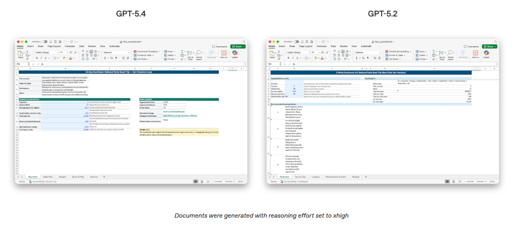 特にスプレッドシートと資料作成の強化が目立つ。投資銀行のジュニアアナリストが行うような財務モデリングタスクでは、GPT‑5.4が平均87.3%のスコアを記録(GPT‑5.2は68.4%)。プレゼンテーション評価では、人間の評価者の68.0%がGPT‑5.4の出力をGPT‑5.2より好ましいと判定した。