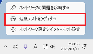 タスクバーのネットワークアイコンまわりに「速度テストを実行」ショートカットが追加されました。