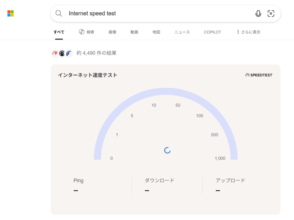 クリックするとデフォルトブラウザが起動し、Bing上でOokla提供のSpeedtestが開きます。「ネイティブ機能とはいえBingに飛ばされる」という点は賛否あるところですが、ブラウザを別途開く手間が省けるのは確かです。
