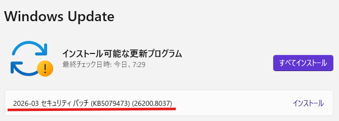 「2026-03 Security Update (KB5079473)」が表示されたらインストールを実行してください。