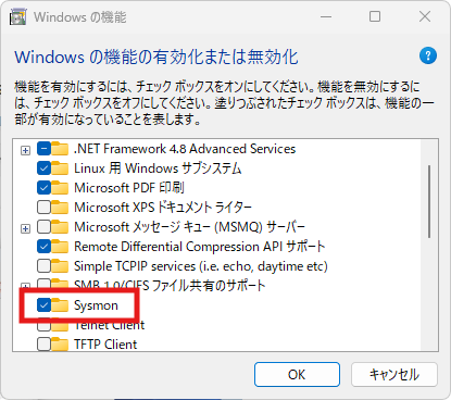 設定 → システム → オプション機能 → Windowsのその他の機能 → Sysmon